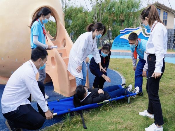 演练包括疫情防控专项演练、消防安全专项演练,以及游客突发事故应急救援演练三部分。消防安全专项演练模拟淘气堡发生火情的应急处置情况。疫情防控专项演练模拟游客入园未扫场所码和未佩戴口罩入园等应急处置情况。游客突发事故应急救援演练模拟观光车刹车失灵和游客从高处坠下等应急救援工作。